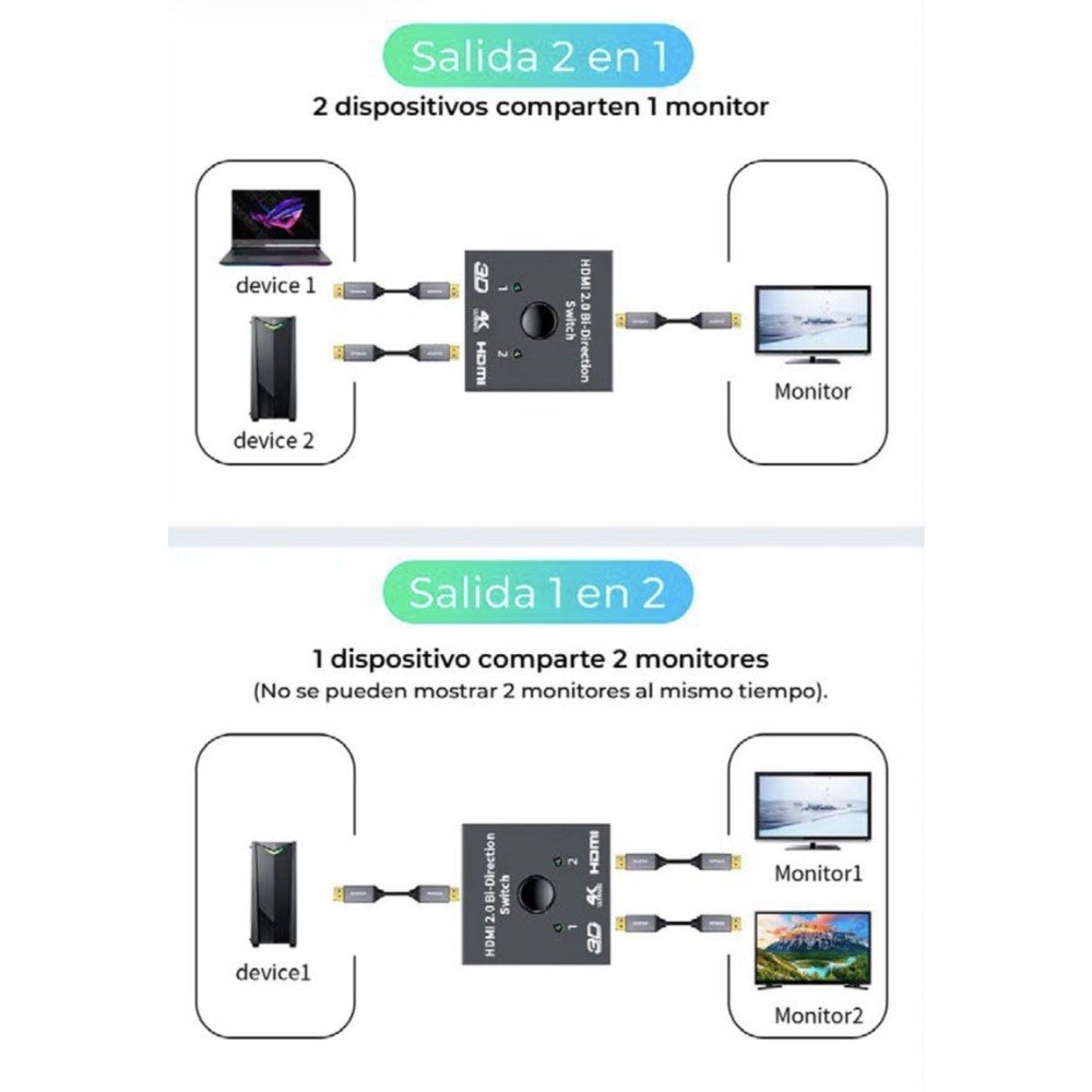 Este Adaptador/Switch HDMI Bidireccional 4K es la herramienta versátil que necesitas. A diferencia de los splitters tradicionales que solo funcionan en una dirección, este dispositivo inteligente te permite alternar la señal en dos modos diferentes, adaptándose a tus necesidades del momento. Su diseño compacto y fácil de usar lo hace perfecto para el hogar, la oficina o para configuraciones de gaming.