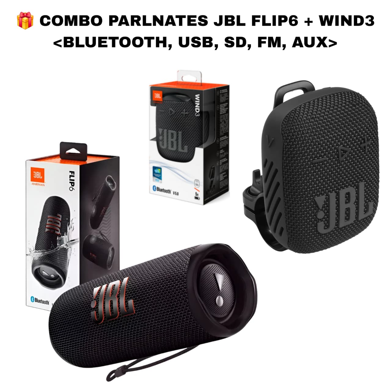 Aquí tienes las características principales de un combo de altavoces: JBL Flip 6 y JBL Clip 3 — dos parlantes Bluetooth portátiles populares de JBL, cada uno con su estilo y uso ideal 📢🎶: