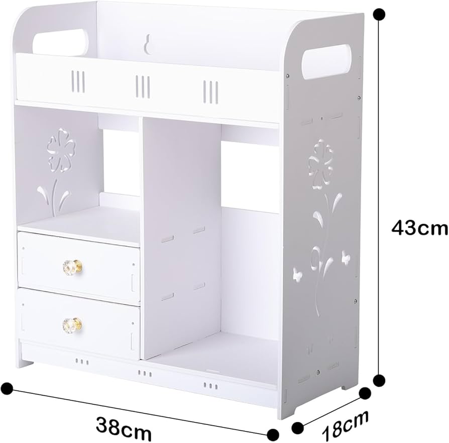 Características adicionales: Cuenta con múltiples compartimentos abiertos y dos cajones pequeños, así como detalles decorativos recortados en los laterales.