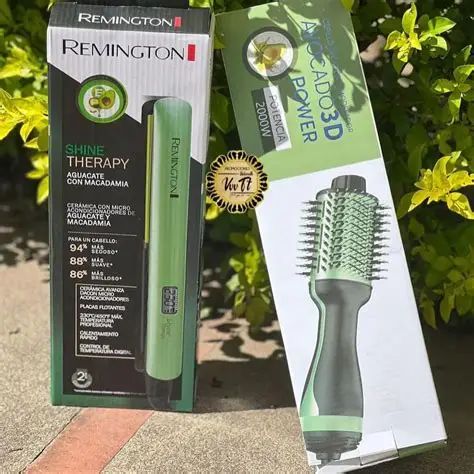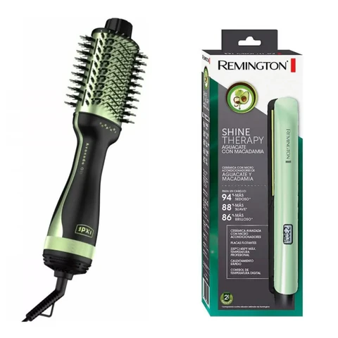 Plancha Remington Shine Therapy, presentada en su empaque original. Está equipada con tecnología de aceites de aguacate y macadamia, que ayudan a proteger el cabello y aportar mayor brillo y suavidad durante el alisado. Ideal para lograr un cabello liso, sedoso y con apariencia saludable.